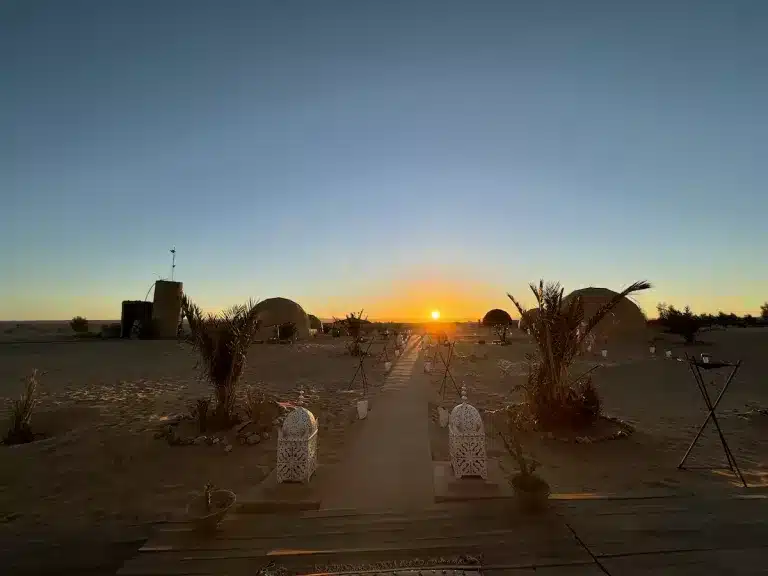 En el corazón de este «mar de arena dorada» se encuentra nuestro campamento de jaimas, un lugar verdaderamente evocador. Desde aquí, y si el tiempo y la metereología nos lo permite disfrutaremos de uno de los mejores atardeceres que hayais visto en vuestra vida, una puesta de sol mágica, y más tarde nos maravillaremos con un cielo nocturno iluminado por estrellas que parecen surgir de la nada. Además, disfrutaremos de una cena en este remoto campamento, donde las tiendas ofrecen todas las comodidades necesarias para una noche de descanso y confort.